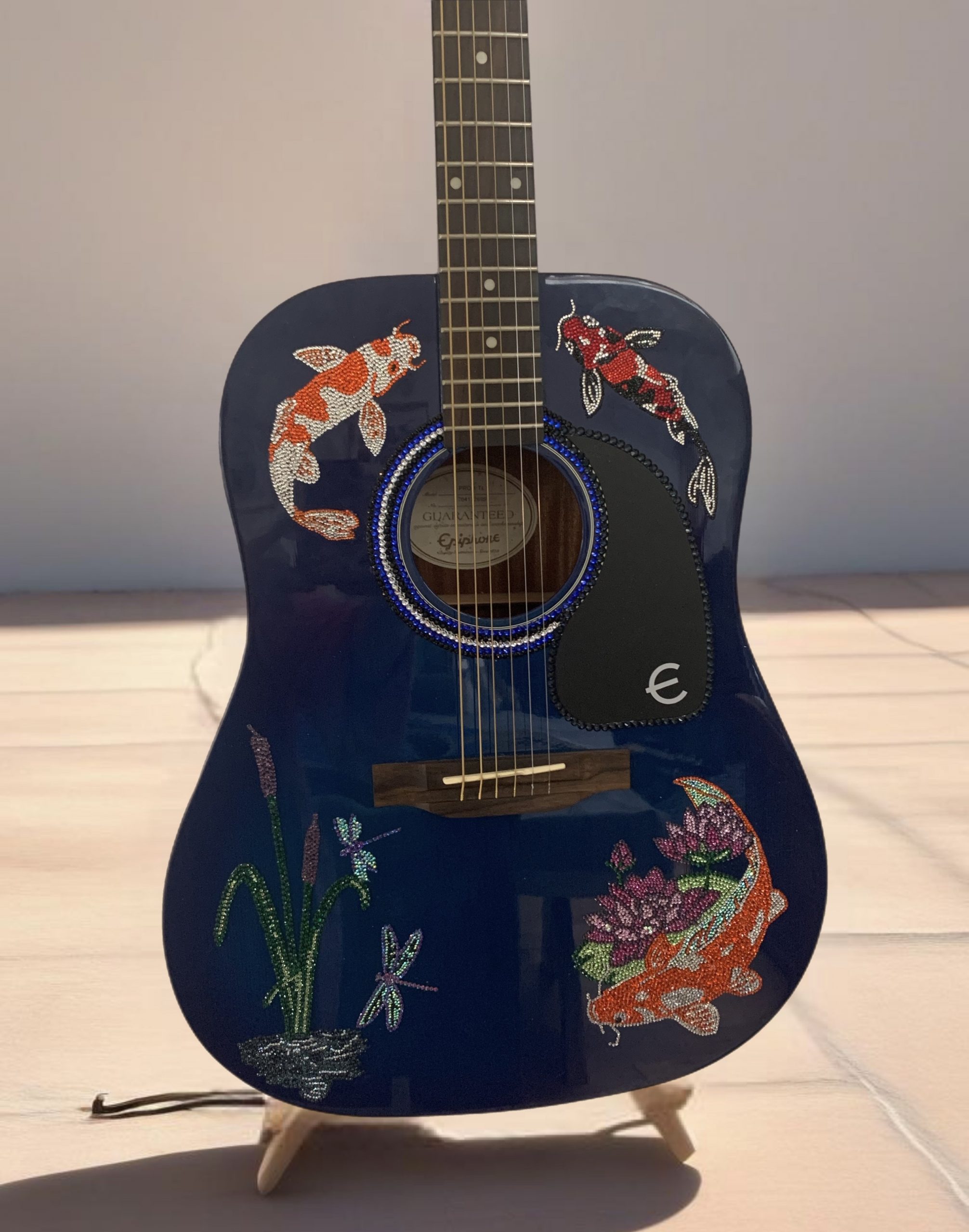 Hand finished rhinestone Acoustic Guitar. Koi fish detail. A unique piece of art, fully playable for that extra special gift.